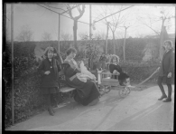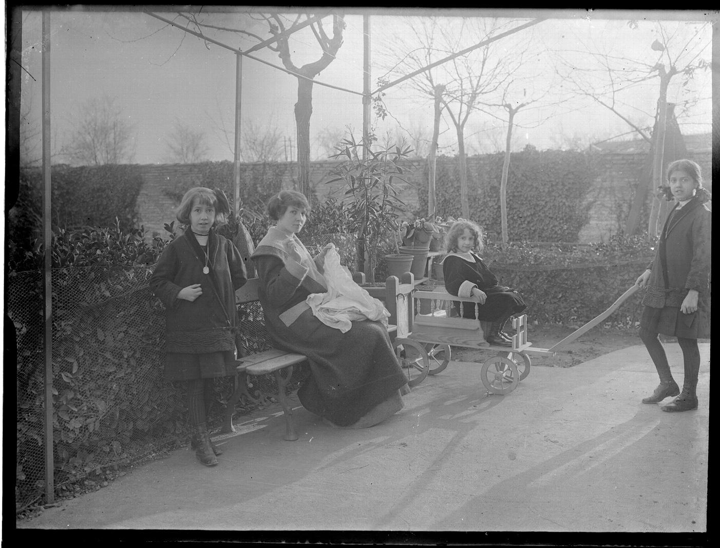 Retrato de 3 niñas, las hermanas María Josefa, Jenara y María Altadill Aldave, acompañadas por su institutriz, una mujer joven que realiza labores de costura sentada sobre un banco, tomado en la terraza de "Garden House", la casa de recreo familiar situada en el paraje de La Magdalena en Pamplona.