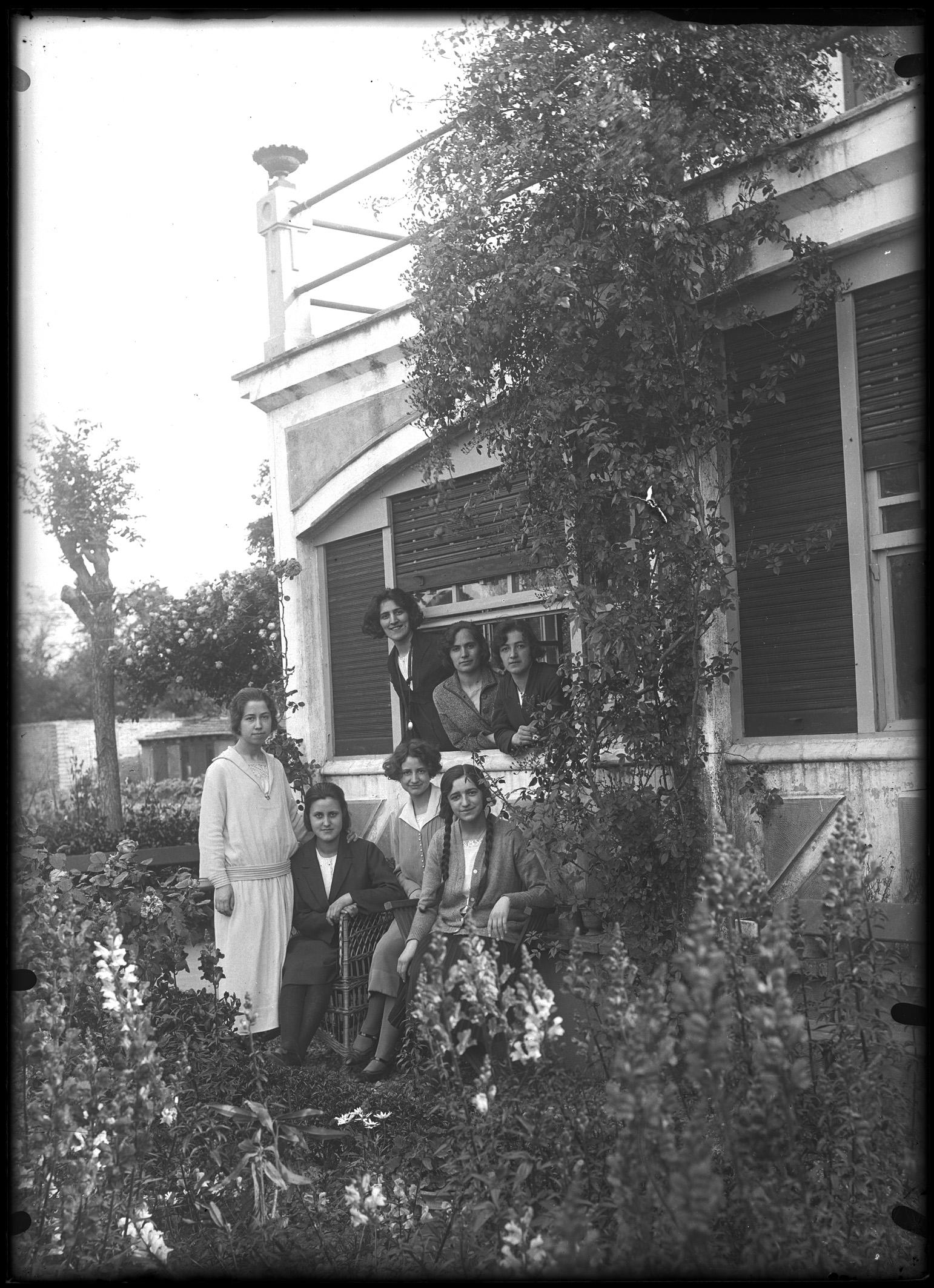 Retrato de un grupo de 7 mujeres jóvenes en la casa de recreo familiar situada en el paraje de La Magdalena en Pamplona. La primera de la izquierda, María Josefa Altadill Aldave, la tercera, Jenara Altadill Aldave (sentada).