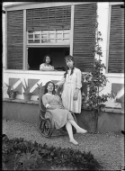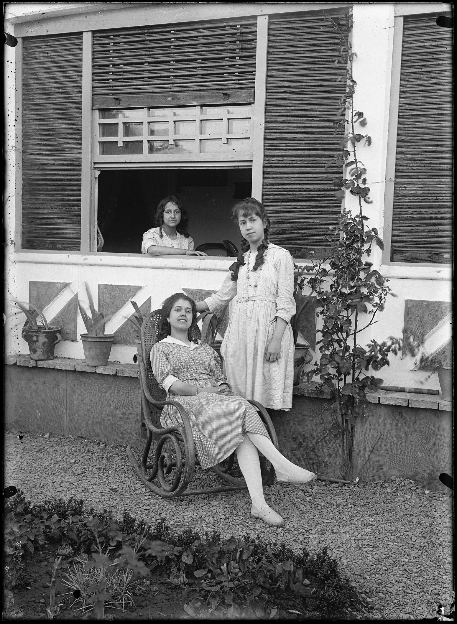 Retrato en plano entero de María, sentada, María Josefa, en pie, y Jenara Altadill Aldave, en la ventana, en el jardín de "Garden House", la casa de recreo de la familia Altadill Aldave situada en el paraje de La Magdalena en Pamplona.
