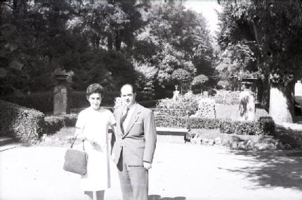 Retrato en plano medio americano de María Pilar Azparren Pérez, hija de Pedro Azparren Orrio y Águeda Pérez Vidaurreta, y un hombre en los jardines del parque de la Taconera en Pamplona.