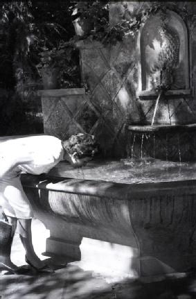 Retrato en plano entero de María Pilar Azparren Pérez, hija de Pedro Azparren Orrio y Águeda Pérez Vidaurreta, bebiendo de una fuente situada en el parque de la Taconera en Pamplona.