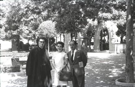 Retrato en plano medio de Ignacio Azparren Pérez y su hermana, Mª Pilar, hijos de Pedro Azparren Orrio y Águeda Pérez Vidaurreta, con un hombre delante del estanque del parque de la Media Luna de Pamplona.