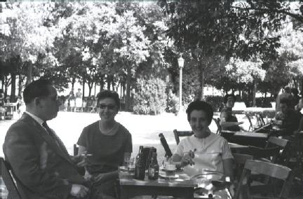 Retrato en plano medio de María Pilar, su hermana Mª Rosario Azparren Pérez, hijas de Pedro Azparren Orrio y Águeda Pérez Vidaurreta, y Gonzalo Arana, marido de ésta, sentados en la terraza del bar del parque de la Media Luna de Pamplona.