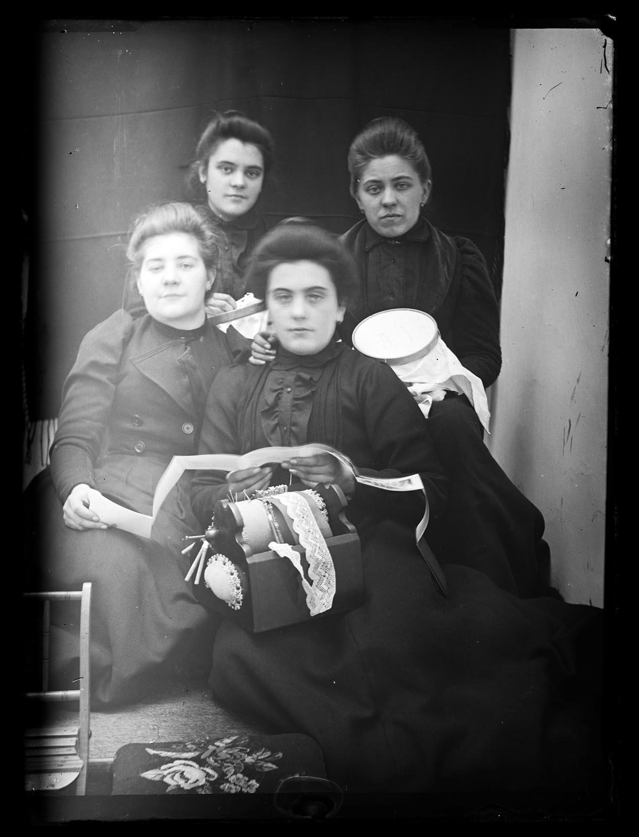 Retrato en plano entero de 4 mujeres sentadas con elementos de bordado y encaje. En primer término, una hermana Francisco Iraizoz Gastesi, marido de María Vicenta Astiz Iriarte, y una mujer. En segundo plano, otra hermana de Francisco y su mujer, María Vicenta.