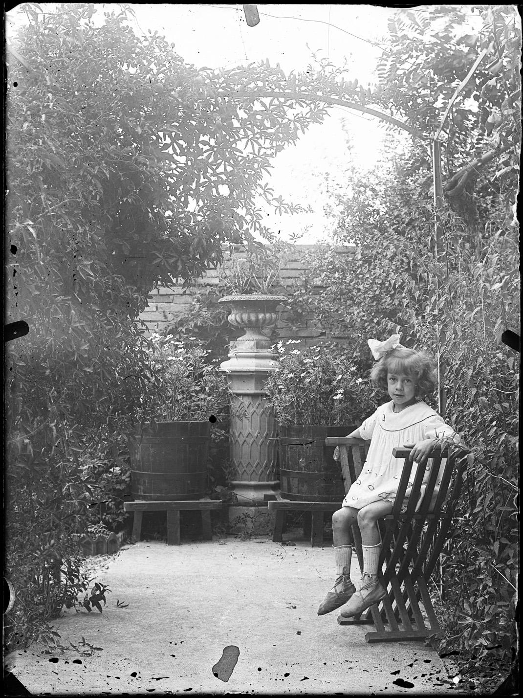 Retrato en plano entero María del Carmen Altadill Aldave, sentada, en el jardín de "Garden House", la casa de recreo familiar situada en el paraje de La Magdalena en Pamplona.