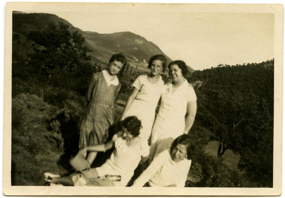 Retrato de 5 muchachas tomado en un paisaje rural de la Zona Media de Navarra. Entre ellas, las hermanas Jenara (sentada, primera por la izquierda), María del Carmen (en pie, segunda) y María (en pie, tercera) Altadill Aldave.