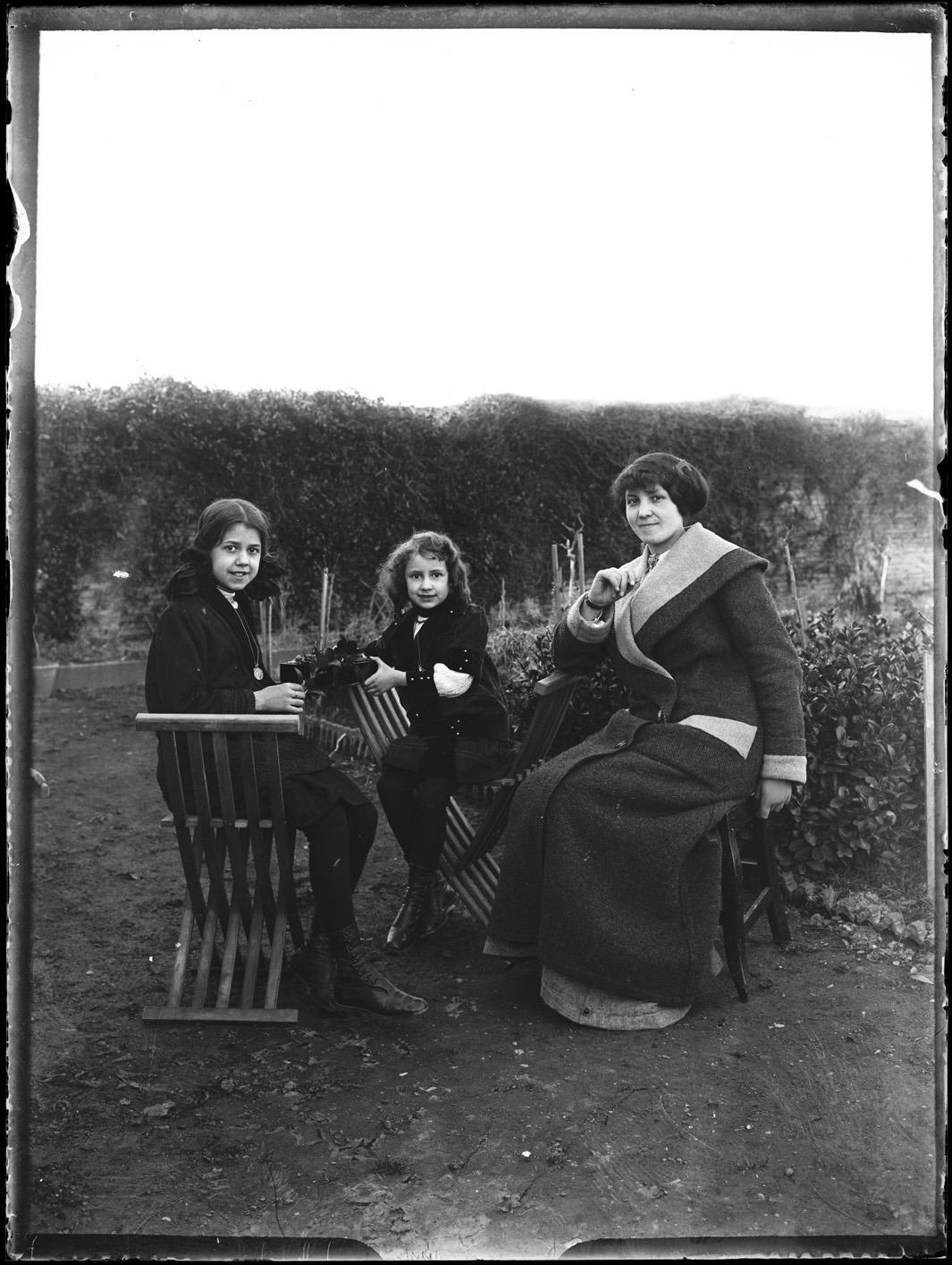 Retrato en plano entero de María y Jenara Altadill Aldave y una institutriz sentadas en unas sillas en el jardín de "Garden House", la casa de recreo de la familia Altadill Aldave situada en el paraje de La Magdalena en Pamplona.