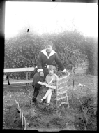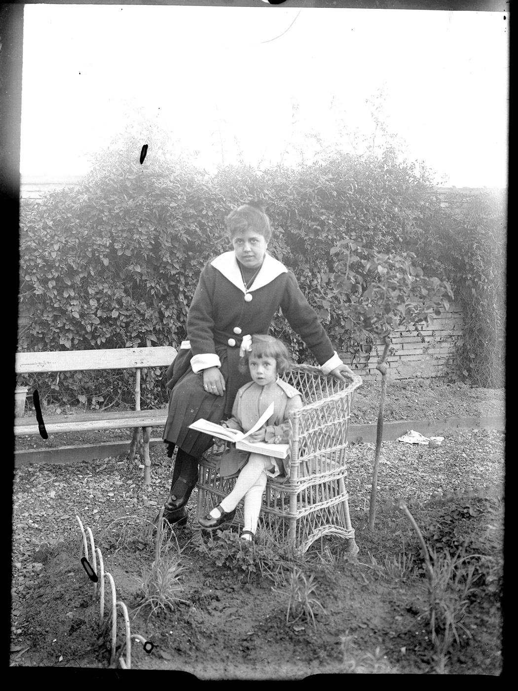 Retrato de las hermanas María y María del Carmen Altadill Aldave, sentadas sobre un sillón de mimbre en el jardín de "Garden House", la casa de recreo familiar situada en el paraje de La Magdalena en Pamplona.