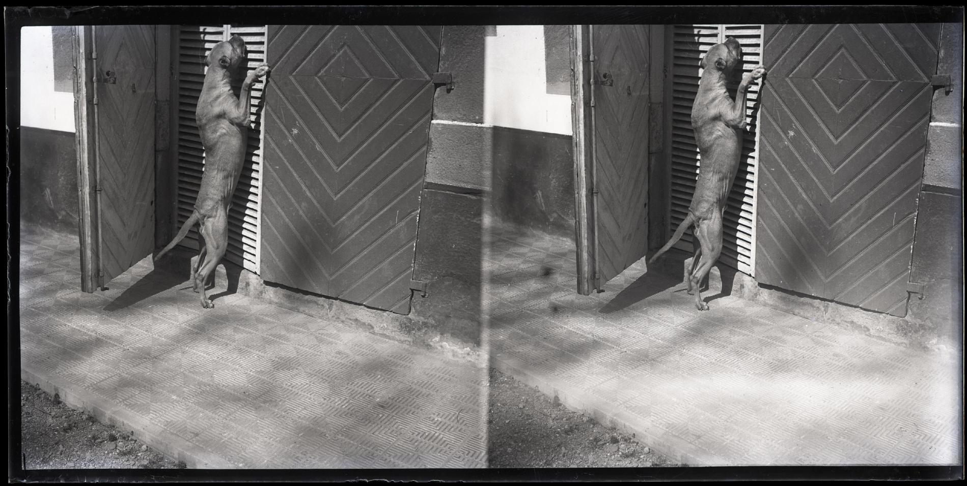• Contenido: Imagen del mastín que Pedro Pedro Ciga Mayo tenía en el Señorío de Bertiz, Oyeregui, encaramado a una puerta del palacio.