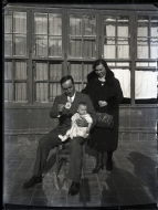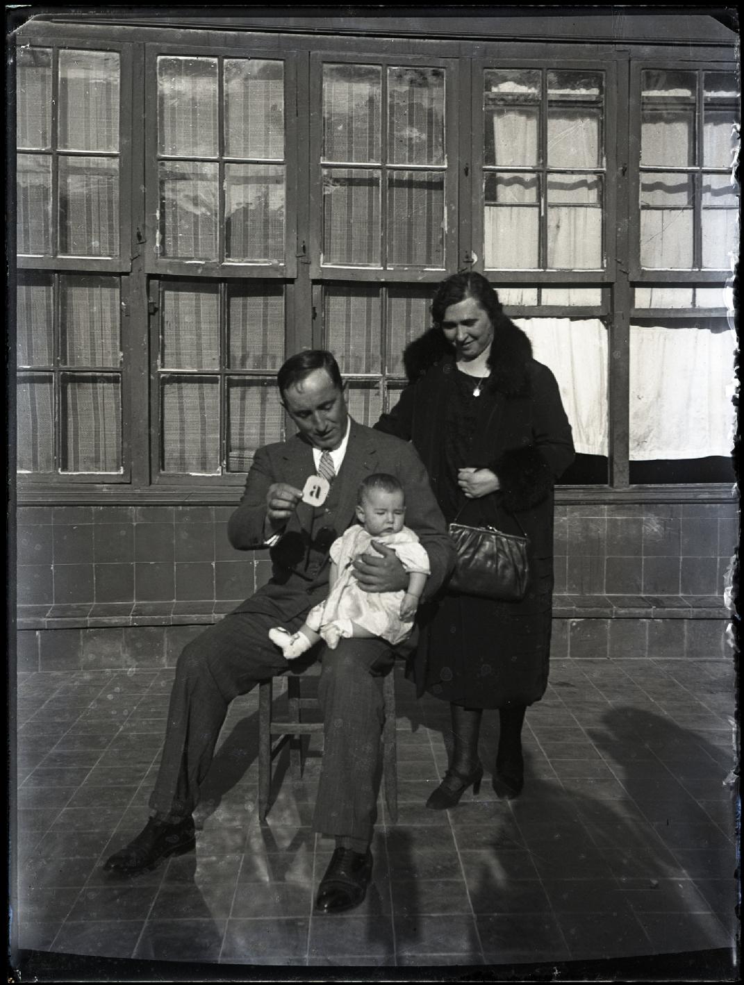 • Contenido: Retrato en plano entero de un hombre y una mujer con un bebé. En primer término, el hombre sentado en una silla sujeta al bebé en su rodilla, en su izquierda, la mujer de pie se apoya en la silla. Al fondo, un ventanal.