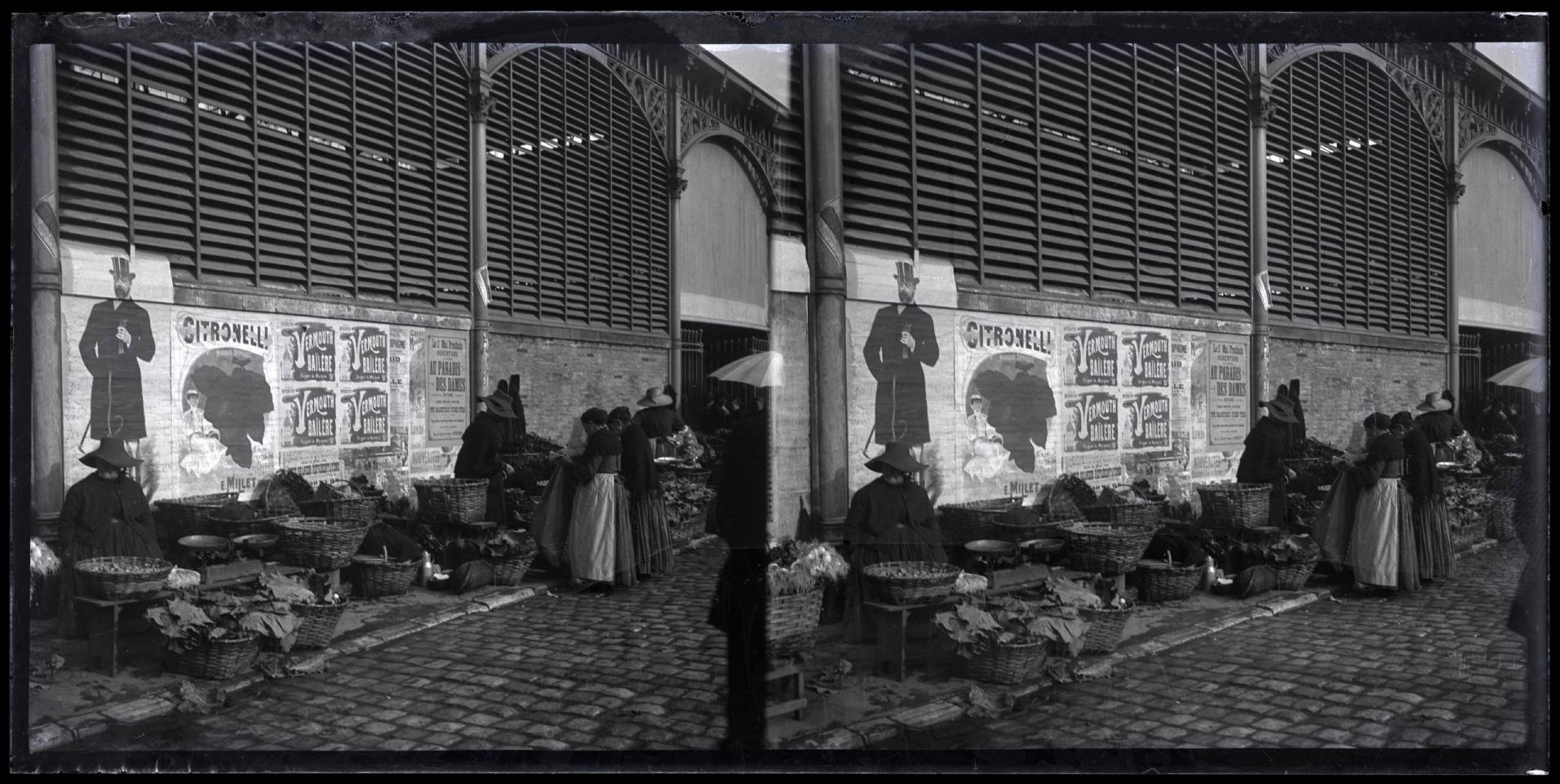 • Contenido: Vista parcial del exterior del mercado de la ciudad de Bayona, Francia, con los puestos de verdura, fruta y hortalizas en la fachada. En la pared, varios carteles: "CITRONELLA / E. MILLET", "VERMOUTH BAILÈRE" Y "AU PARADIS DES DAMES".