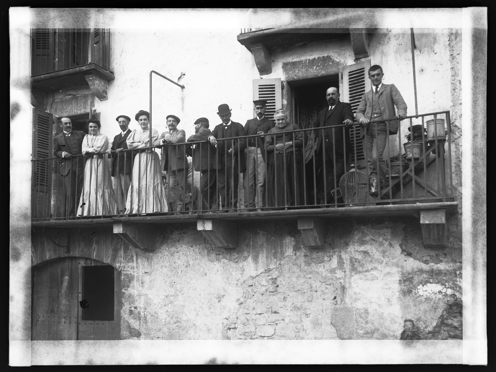 Retrato de un grupo de 11 personas , 3 mujeres y 8 hombres, en el balcón de casa Zapatenea de Lecumberri, Navarra. El quinto por la izquierda es Fidel Astiz Iriarte, el décimo, Zacarías Astiz Juanmartiñena y el joven de la esquina, Zacarías Irañeta Astiz, sobrino tutelado por su tío Zacarías.