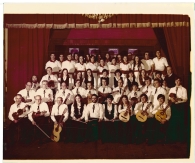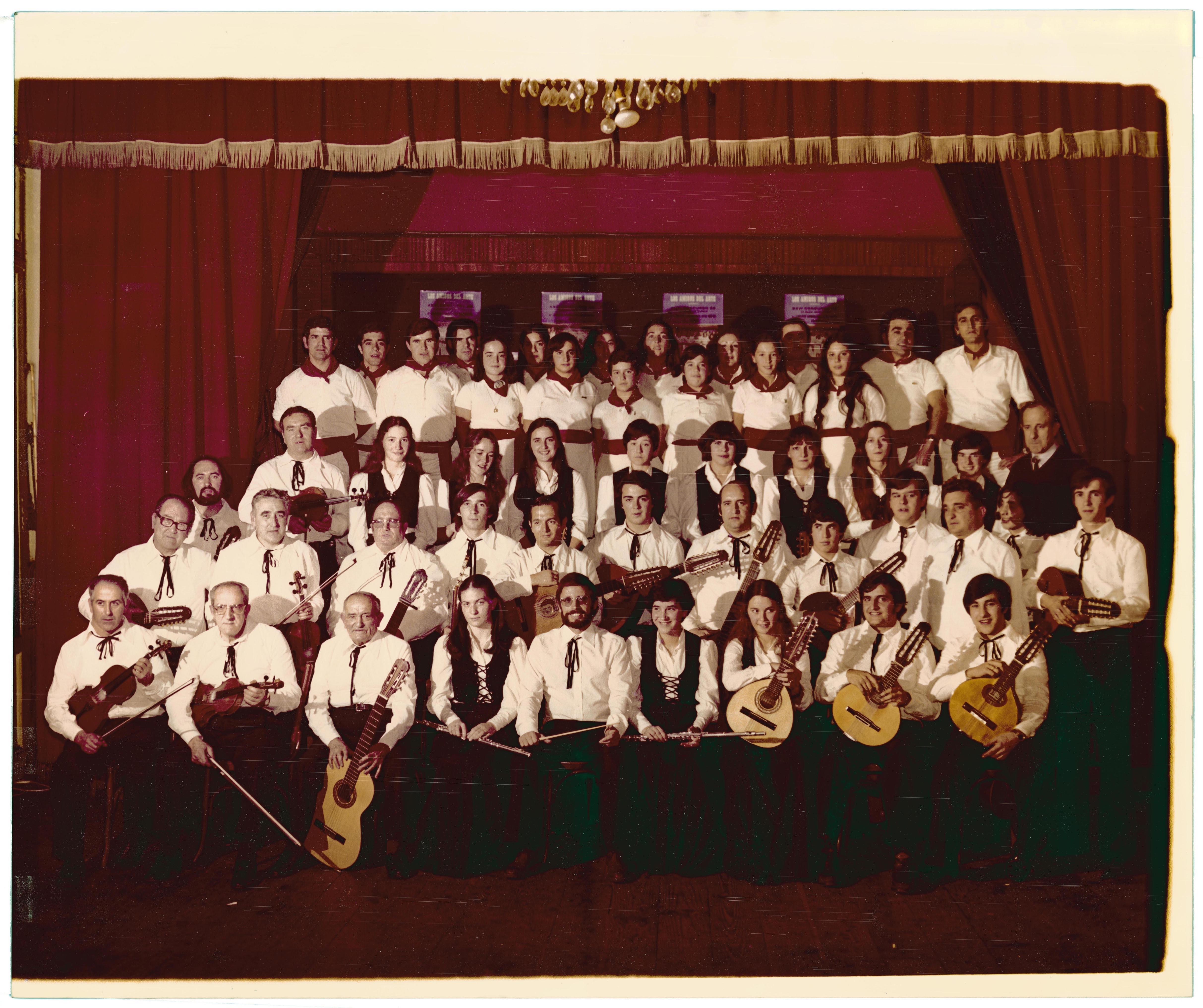 Miembros de la rondalla de la Asociación Musical de Los Amigos del Arte en el escenario de su sede.