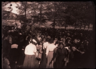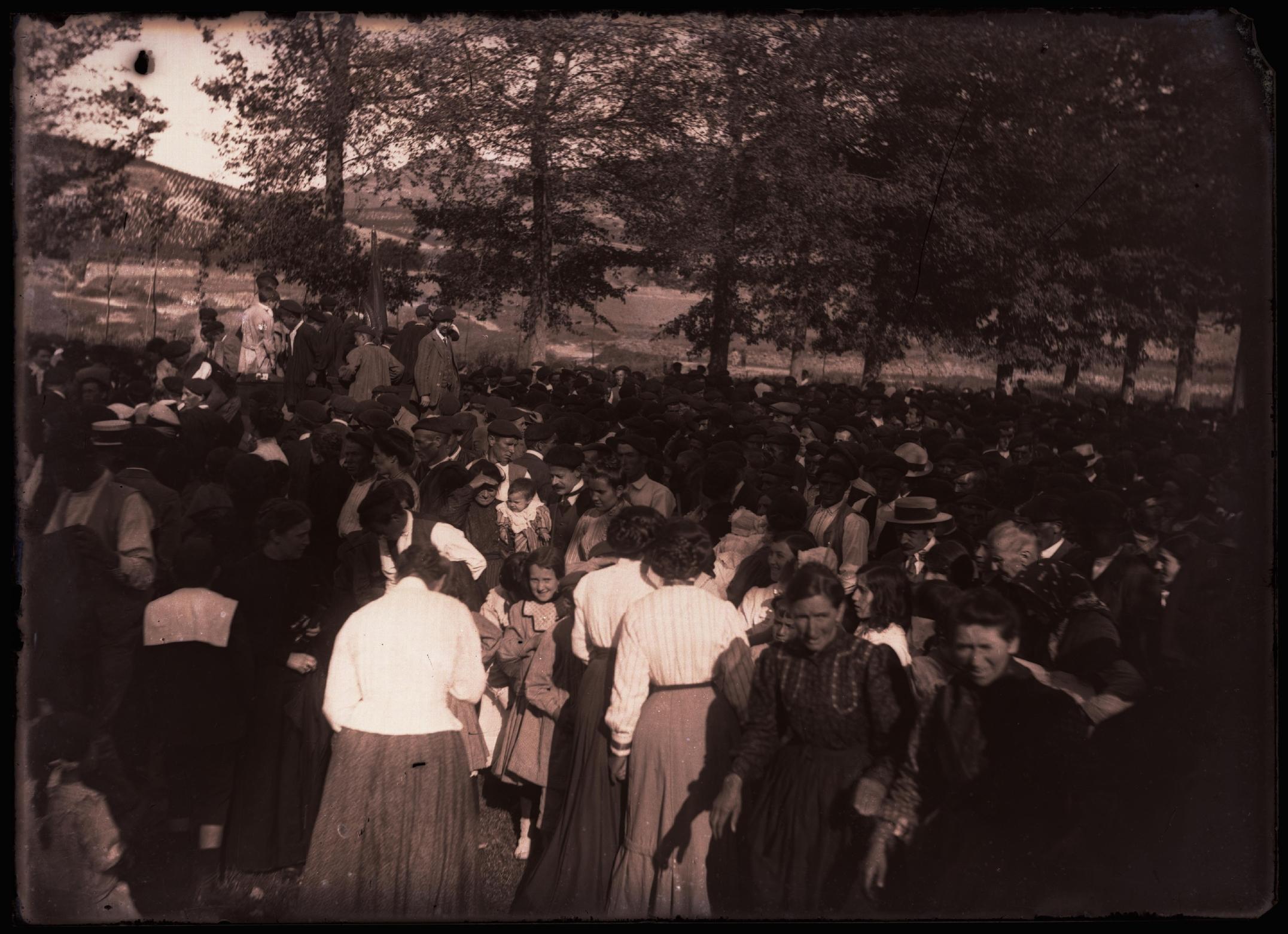 • Contenido: Vista de un numeroso grupo de personas en una campa, bajo los árboles en un mitin en la localidad de Zudaire, municipio de Améscoa Baja.