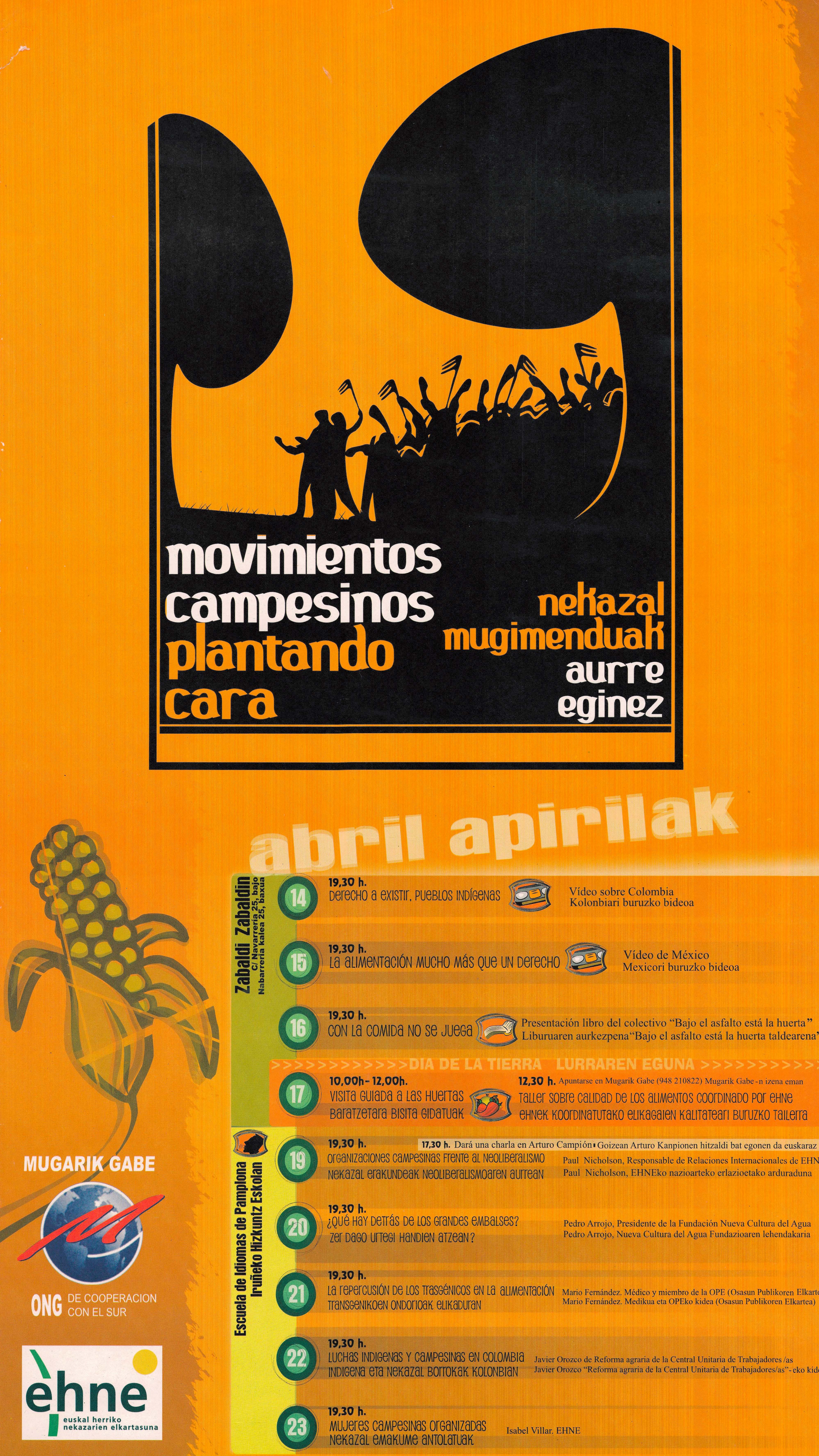 Cartel que anuncia unas jornadas sobre movimientos campesinos y soberanía alimentaria organizados por Mugarik Gabe y EHNE en abril de 2004, y que se celebran en Zabaldi y la Escuela de Idiomas. Actividades: vídeos sobre México y Colombia; presentación del libro "Sobre el asfalto está la huerta"; taller sobre calidad de alimentos coordinado por EHNE; visita a las huertas; charla "Organizaciones campesinas frente al neoliberalismo", con Paul Nocholson, responsable de relaciones internacionales de EHNE; charla "Qué hay detrás de los grandes embalses", con Pedro Arrojo, presidente de la Fundación Nueva Cultura de Agua; charla "La repercusión de los transgénicos en la alimentación", con Mario Fernández, médico y miembro de la OPE; charla "Luchas indígenas y campesinas en Colombia", con Javier Orozco, de la Reforma Agraria de la Central Unitaria de Trabajadores; charla "Mujeres campesinas organizadas", con Isabel Villar (EHNE).