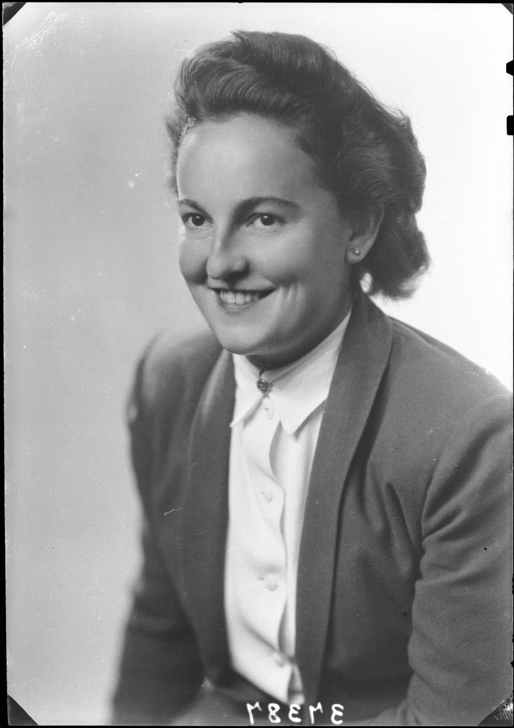 Retrato de estudio en plano medio de una muchacha con blusa y chaqueta.