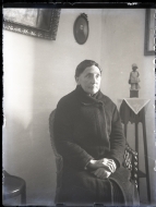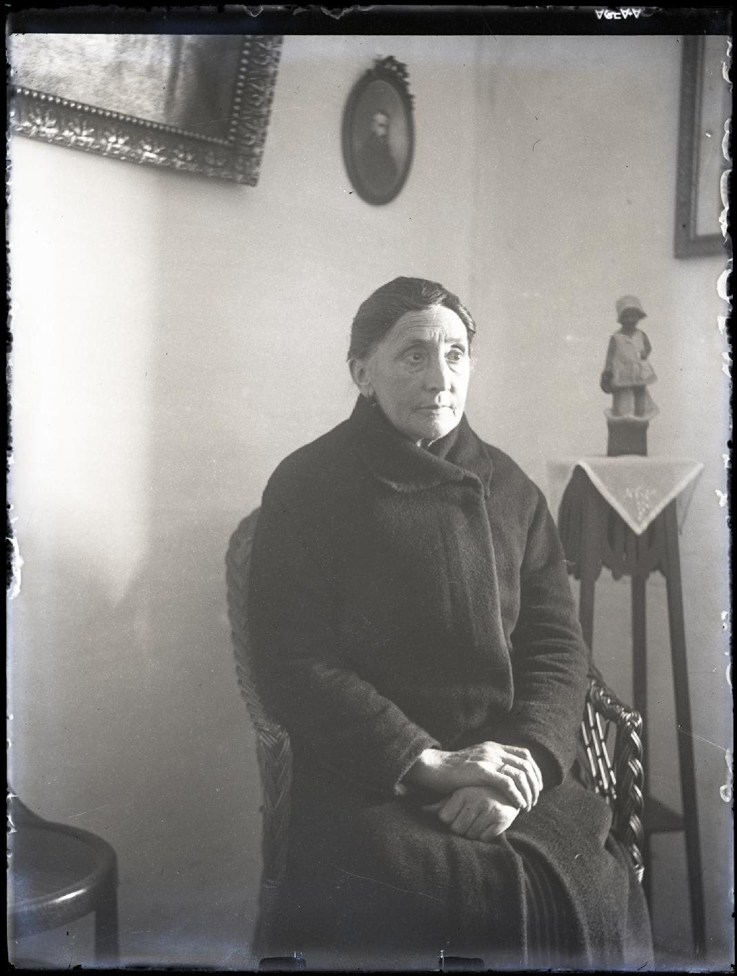 • Contenido: Retrato de una mujer mayor con abrigo sentada en una butaca junto a una peana con una figura.