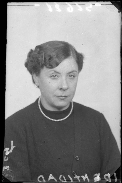 Retrato de estudio en plano medio corto para el Documento Nacional de Identidad de una mujer de mediana edad con collar de perlas y chaqueta.