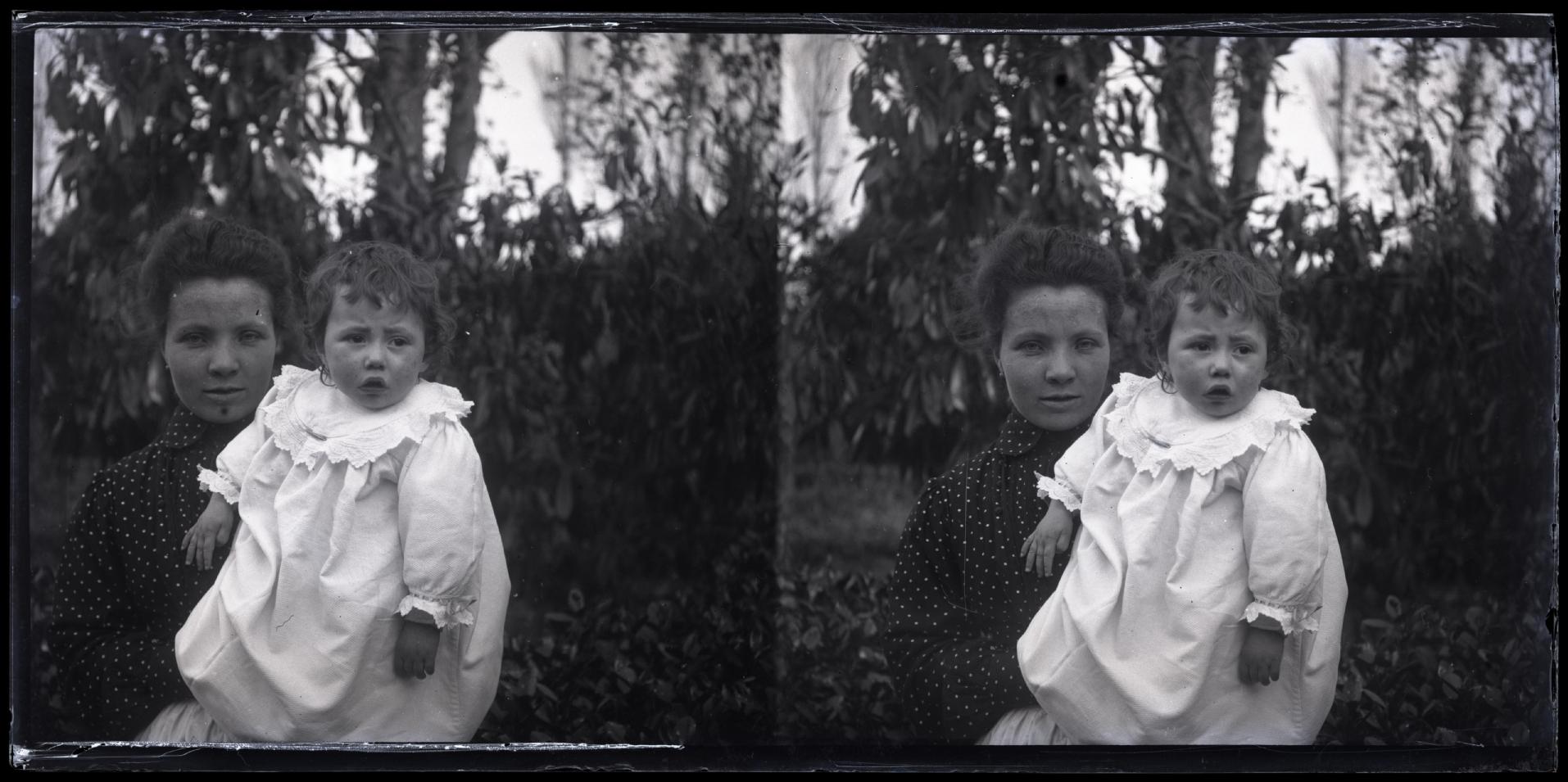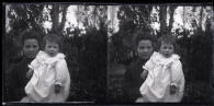 • Contenido: Retrato en plano medio corto de una mujer con un niño en brazos en un jardín.