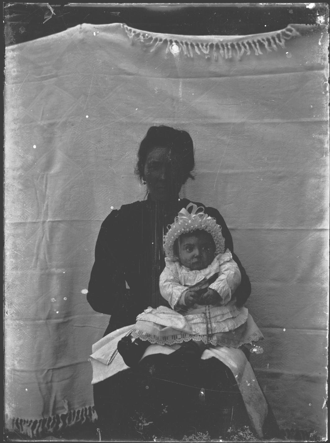 Retrato en plano americano de una mujer procedente de Esáin, sentada con un niño en sus rodillas. De fondo una tela clara.