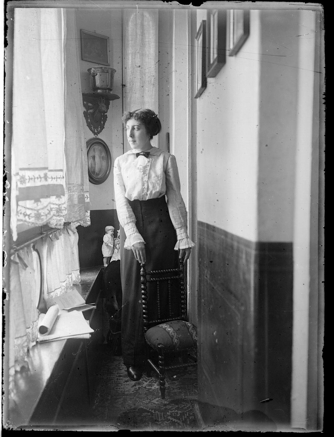 Mujer en pie en la galería del domicilio de la familia Altadill Aldave.