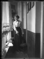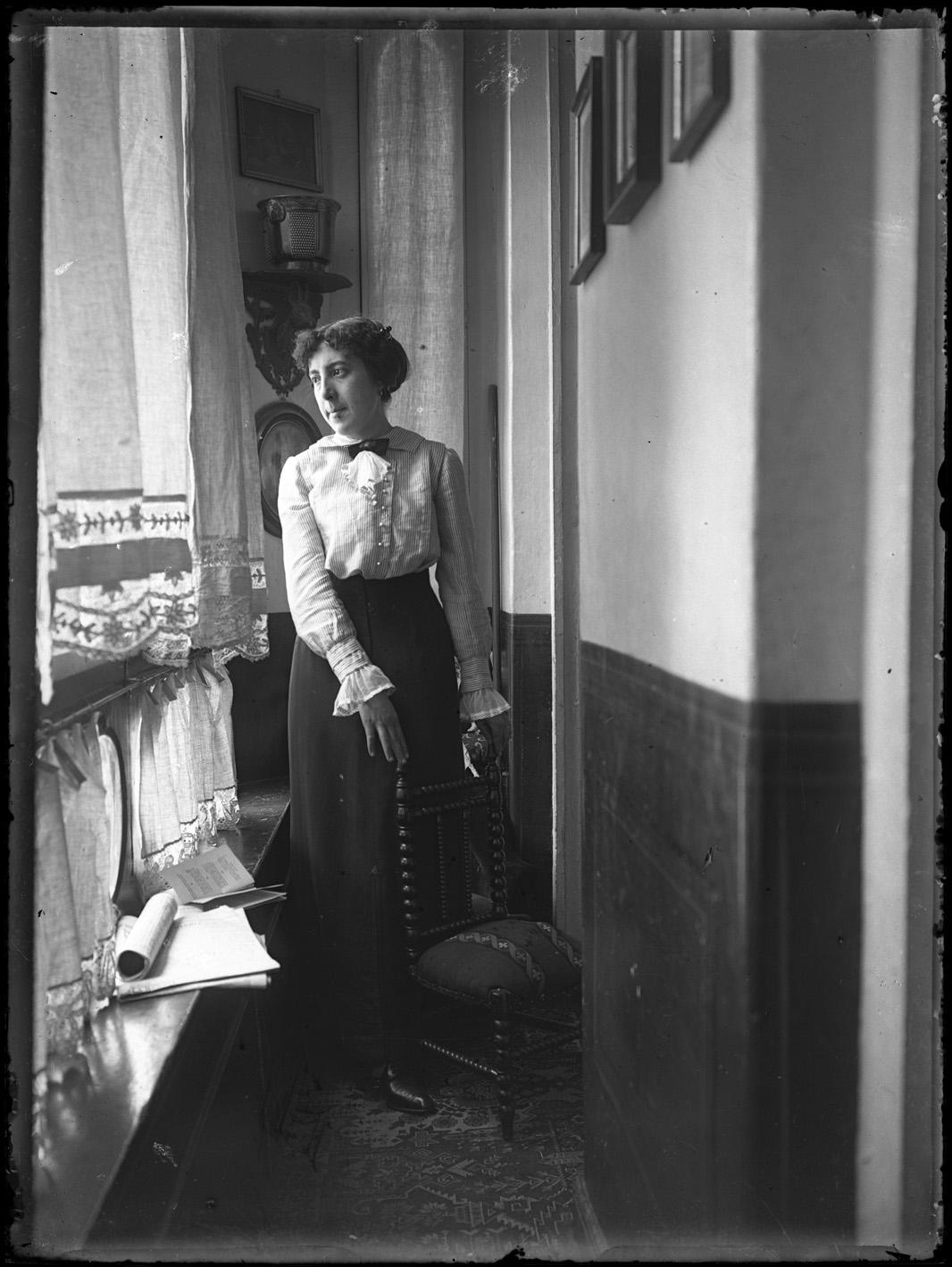 Mujer en pie en la galería del domicilio de la familia Altadill Aldave.