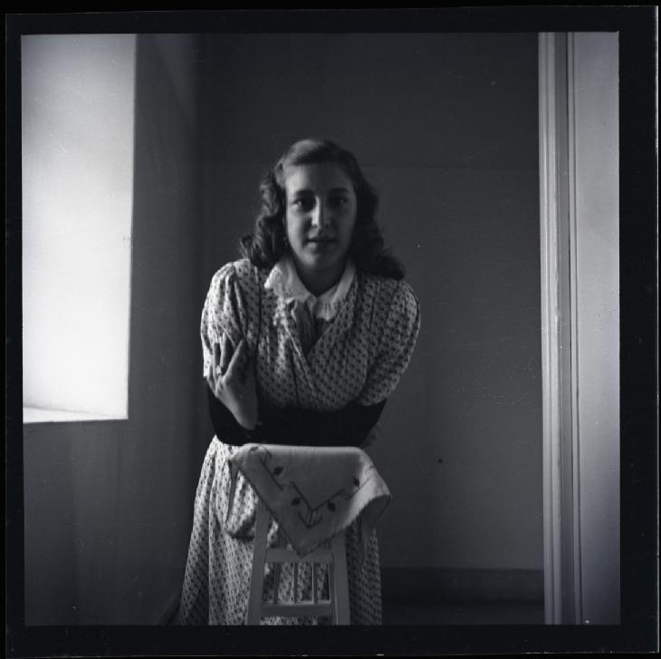 • Contenido: Retrato en plano americano de una mujer joven apoyada en una peana junto a una ventana
