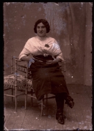 • Contenido: Retrato en plano entero de una mujer joven sentada en una silla con un abanico en las manos.