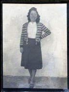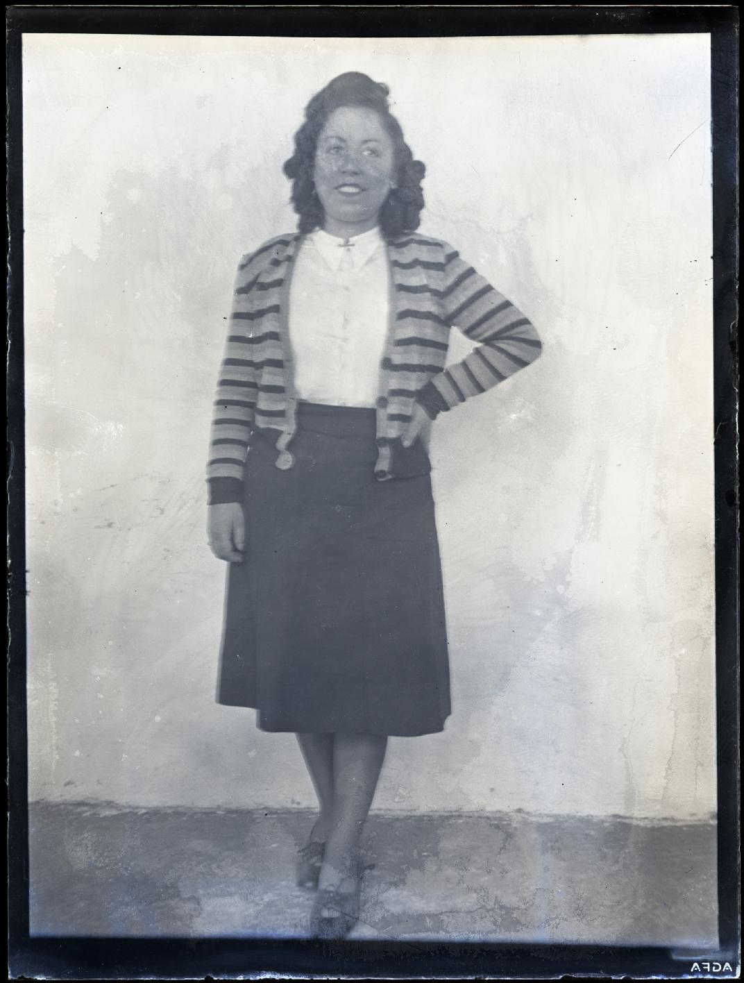 • Contenido: Retrato en plano entero de una mujer joven con una chaqueta de rayas.