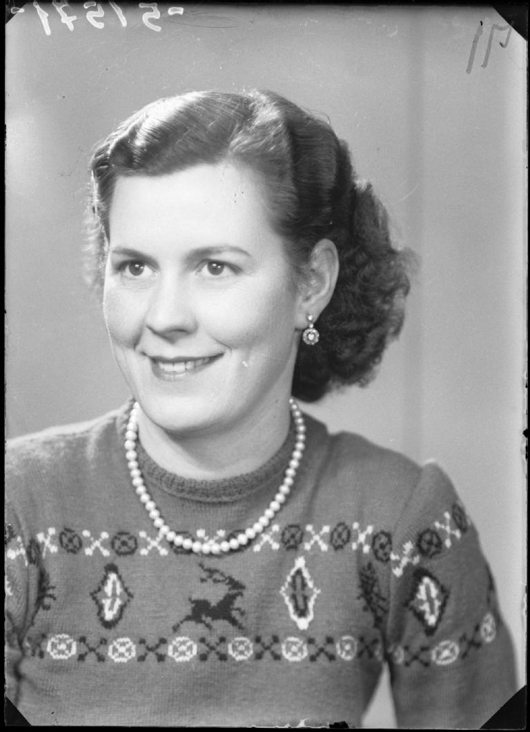 Retrato de estudio en plano medio corto de una mujer joven con jersey de punto y collar de perlas.