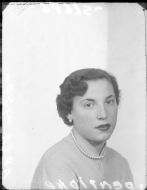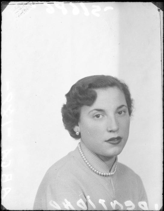 Retrato de estudio en plano medio corto para el Documento Nacional de Identidad de una mujer joven con jersey y collar de perlas.