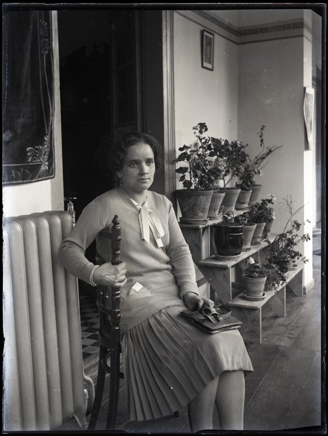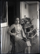 • Contenido: Retrato en plano americano de una mujer joven con un bolso en la mano, sentada en una galería con macetas con plantas.