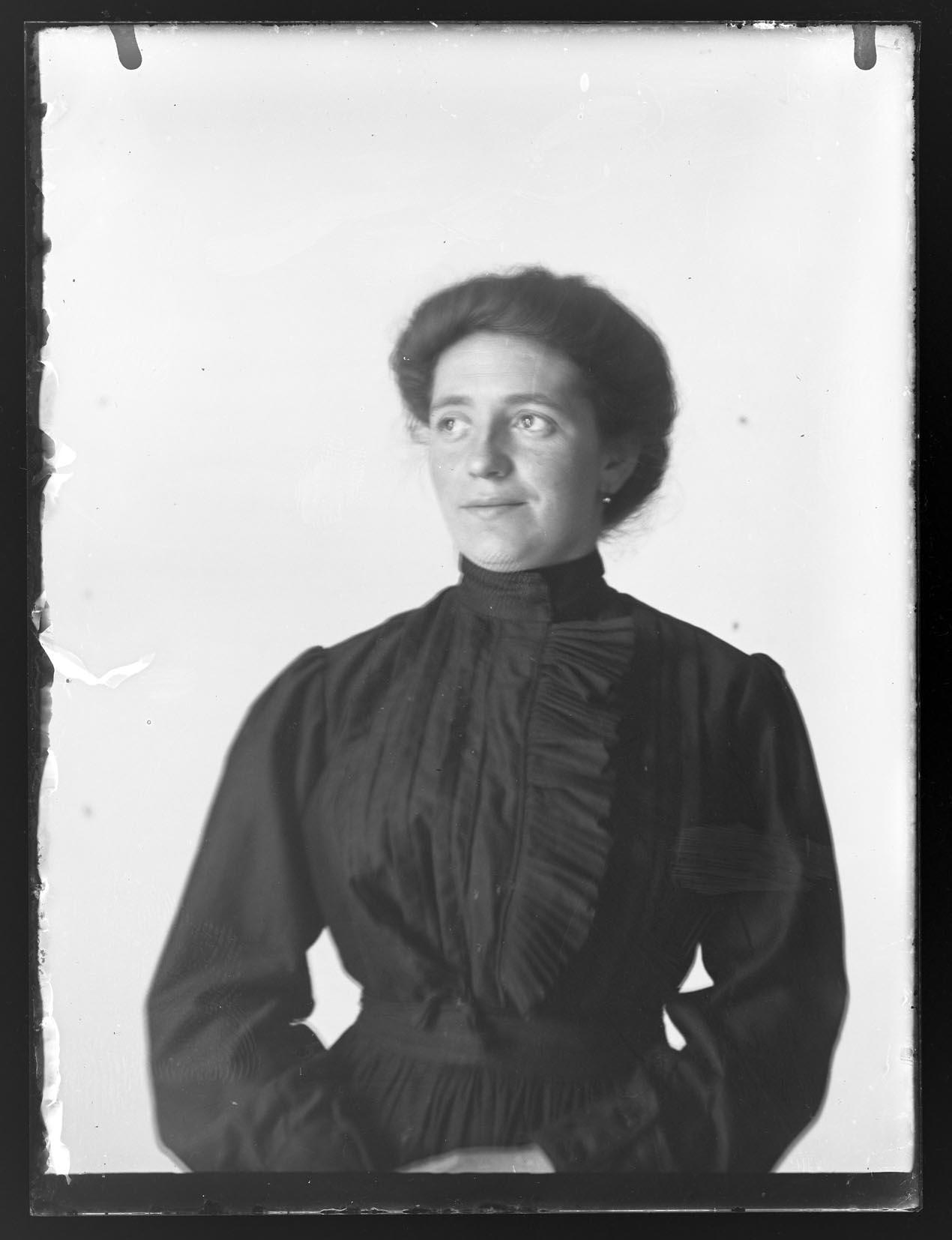 • Contenido: Retrato en plano medio de una mujer joven con vestido oscuro.