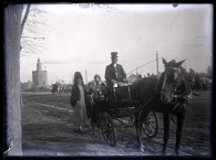 Retrato en plano entero de 2 mujeres en un carruaje junto al río Guadalquivir en Sevilla. En primer término, el carruaje tirado por un caballo y manejado por un hombre uniformado. Detrás, una mujer con mantilla de pie en el exterior y otra con sombreo y estola sentada. Al fondo, la Torre del Oro