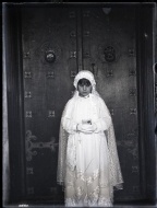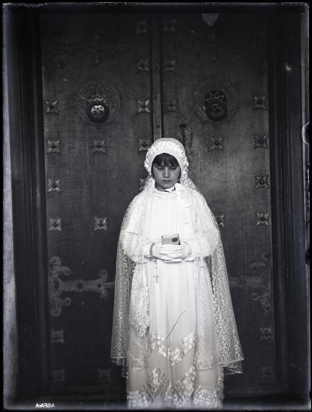 • Contenido: Retrato en plano americano de una niña vestida con un traje de Primera Comunión con un misal en la mano delante de una puerta con herrajes.
