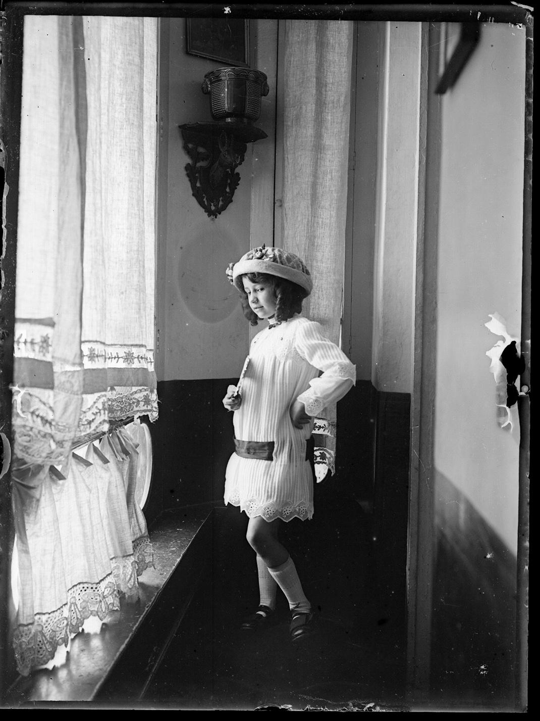 Retrato en plano entero de una niña en pie con vestido y sombrero, tomado en la galería acristalada del domicilio de la familia Altadill Aldave en la calle Calceteros de Pamplona.