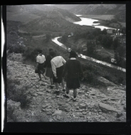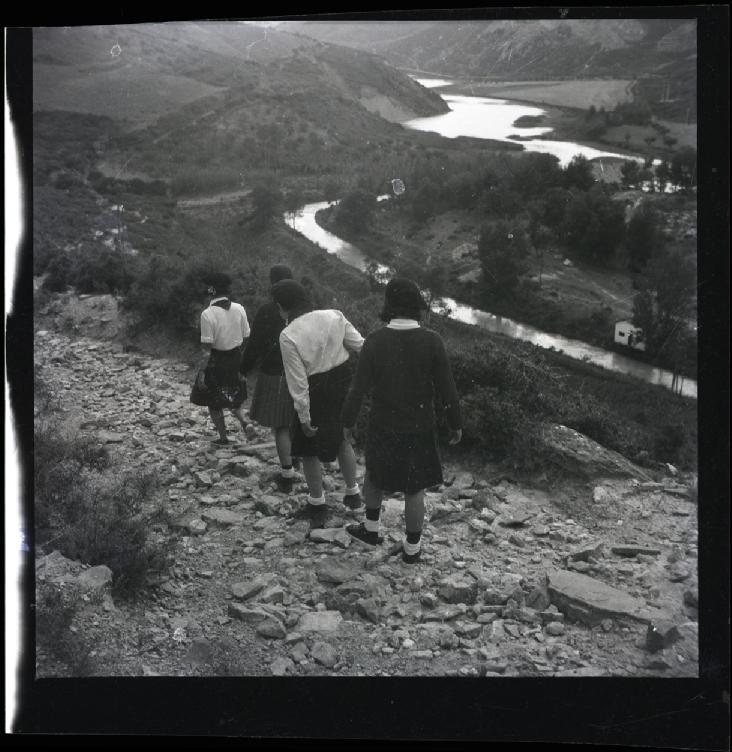• Contenido: Escena de 4 niñas con uniforme del grupo scout de Villava de espaldas bajando por la ladera de un monte. Al fondo, un río y un embalse.