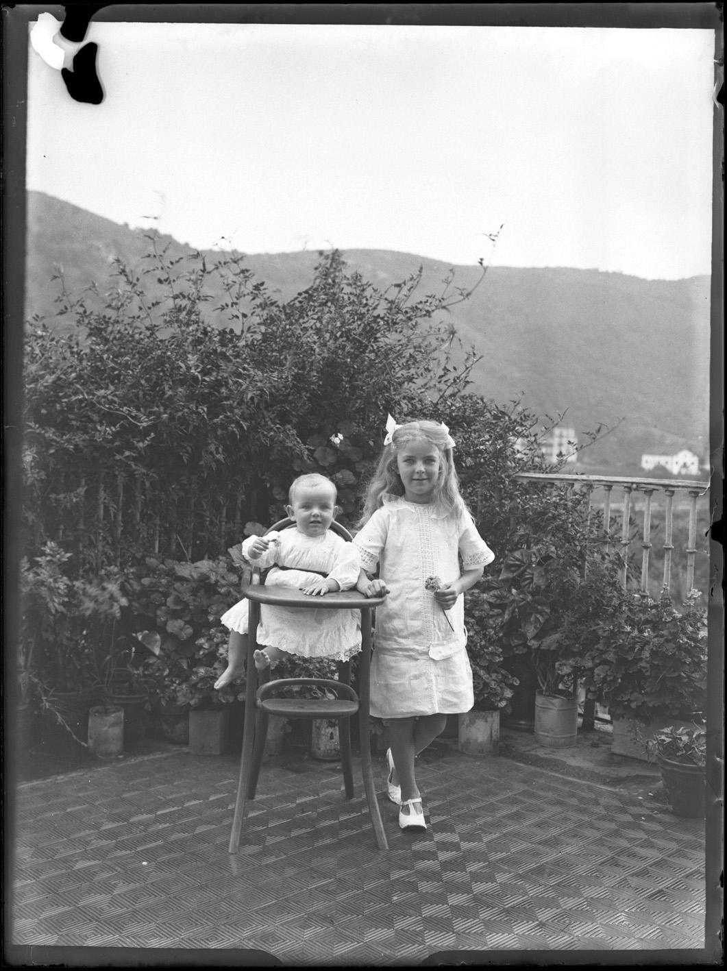 Retrato en plano entero de 2 niñas, una sentada en una trona y la otra en pie con una flor en la terraza de una casa en Oronoz Mugaire (Navarra). En segundo plano, el palacio de Reparacea.