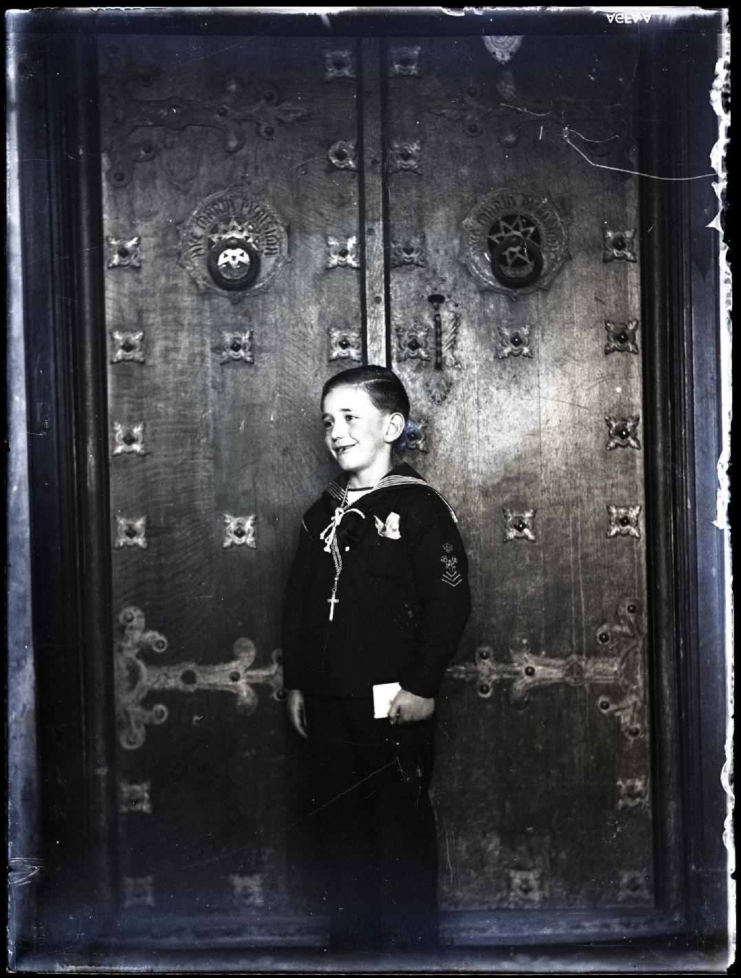 • Contenido: Retrato en plano americano de un niño vestido con un traje de Primera Comunión con un misal en la mano delante de una puerta con herrajes.