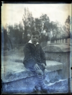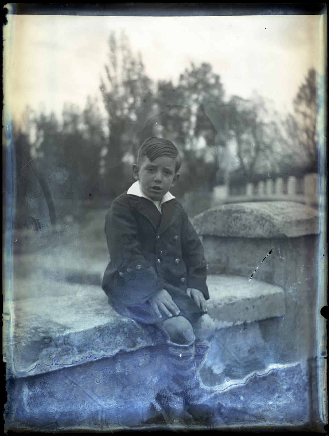 Retrato en plano entero de un niño con abrigo sentado en un muro junto al pente de San Andrés, sobre el río Ulzama, en la localidad de Villava, Navarra.
