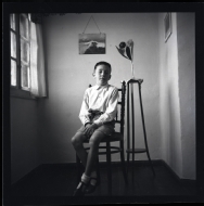 • Contenido: Retrato en plano entero de un niño sentado en una silla junto a una peana con flores.