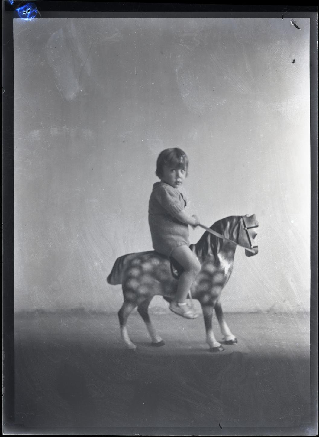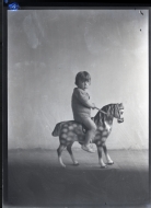 • Contenido: Retrato en plano entero de un niño sobre un caballo de cartón.
