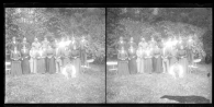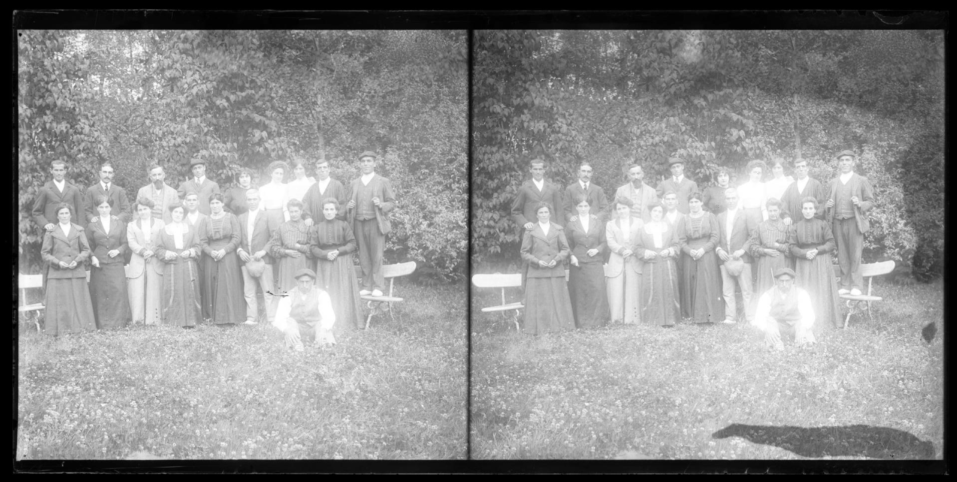 Retrato en plano entero de un grupo de 19 personas compuesto por 10 mujeres y 9 hombres en unos bancos de los jardines del Señorío de Bertiz en Oyeregui, Bertizarana.