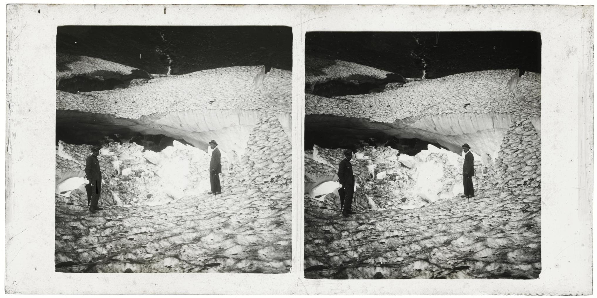 • Contenido: Retrato en plano entero de 2 hombres sobre el hielo de un nevero de montaña.