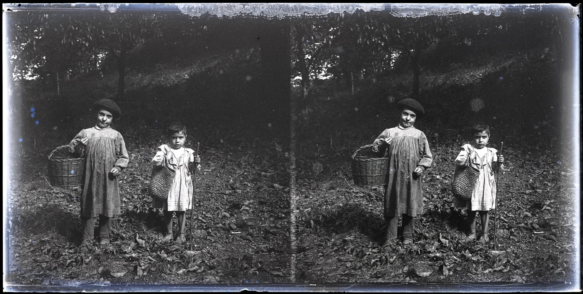 • Contenido: Retrato en plano entero de un niño y una niña con sendas cestas en un bosque.