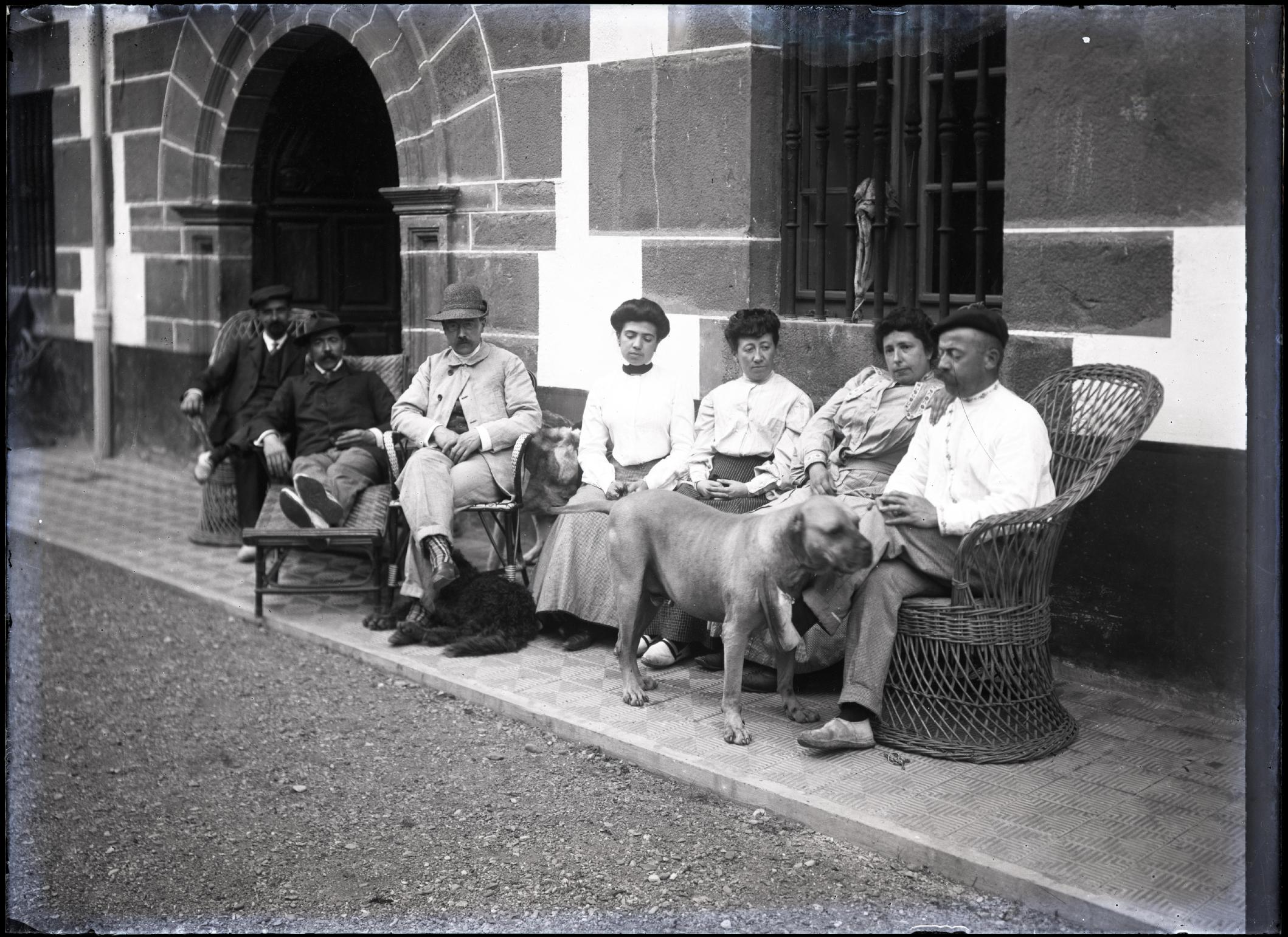 Retrato en plano entero de Pedro Ciga Mayo y Dorotea Fernández Morales con familiares y amigos sentados junto a la portada del palacio del Señorío de Bertiz en Oyeregui, Bertizarana. El primero de la derecha, con un perro, Pedro Ciga y, a su lado, Dorotea. En el centro, Elisa Kast Setz.