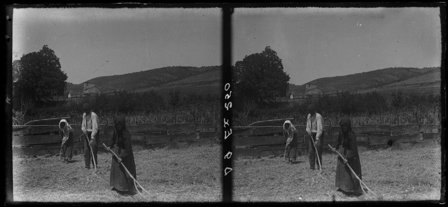 Vista de la mies con la parva extendida y 2 mujeres y un hombre trabajando con las horcas, al fondo, la iglesia de San Juan Bautista de Esáin y el edificio de las escuelas.