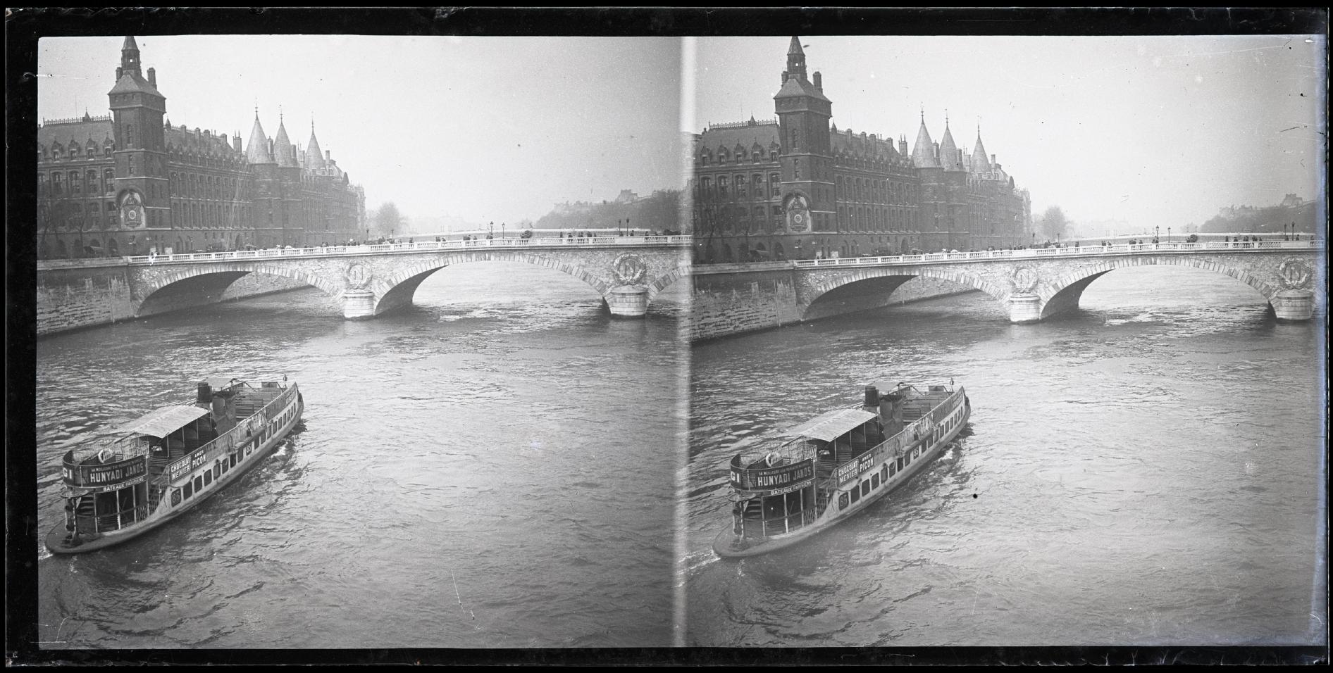 Vista del "Pont au Change" en París, sobre el río Sena, tomada desde el este. En primer término, un barco navegando en el que se leen diferentes carteles: "HUNYADI JANOS", "BATEAUX PARISIENS", "CHOCOLAT MENIER", "AMER PICON" y el número de identificación 85. En segundo plano, el puente con los anagramas de Napoleón III. Al fondo, el palacio de Justicia en la Île de la Cité.