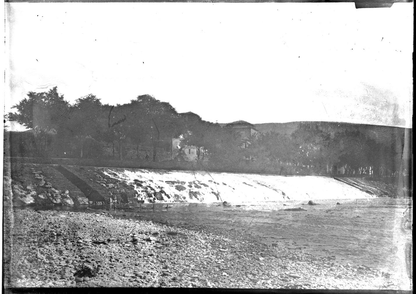 Vista general de la presa del antiguo molino de San Pedro de Ribas o Errotazar sobre el río Arga en el barrio de la Rochapea, en Pamplona, tomada desde la playa de San Pedro hacia el norte. En primer término, el curso fluvial atravesado por la presa. Más atrás, la margen izquierda y, sobre ella, construcciones del convento de San Pedro de Ribas. Al fondo, el monte San Cristóbal - Ezkaba.