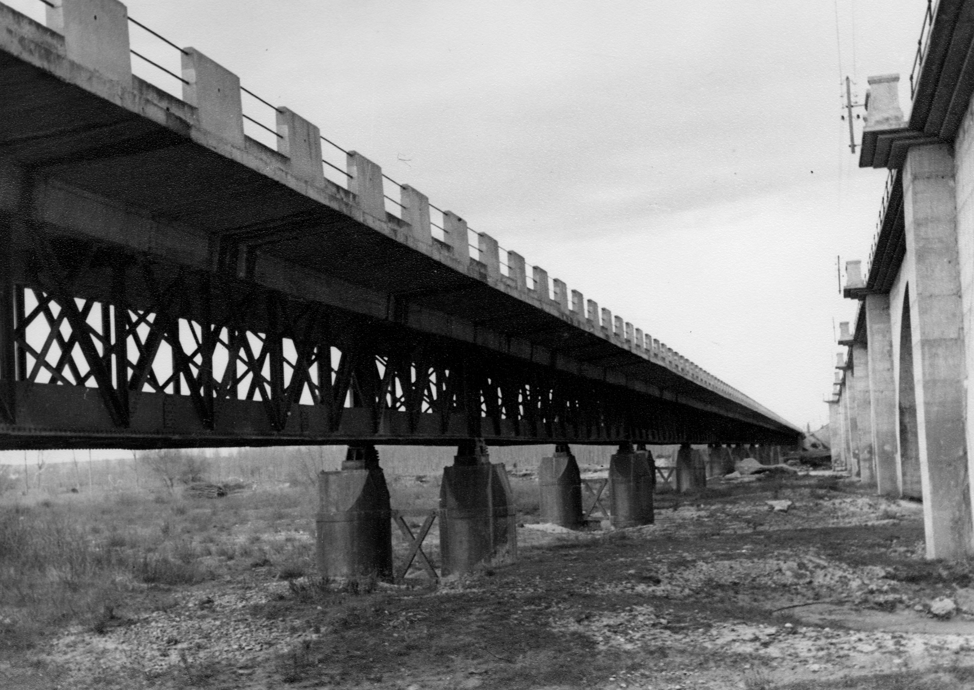 Vista general del puente de la carretera Marcilla - Villafranca (actual NA-660) sobre el río Aragón, en el término municipal de Marcilla, tomada desde el lecho fluvial hacia el noreste. En primer término, la estructura de hierro del puente sobre parejas pilares, con tablero superior y pretiles de hormigón. A la derecha, el puente de hormigón de la línea de ferrocarril Castejón - Alsasua. Al fondo, la chopera del término del Puente.